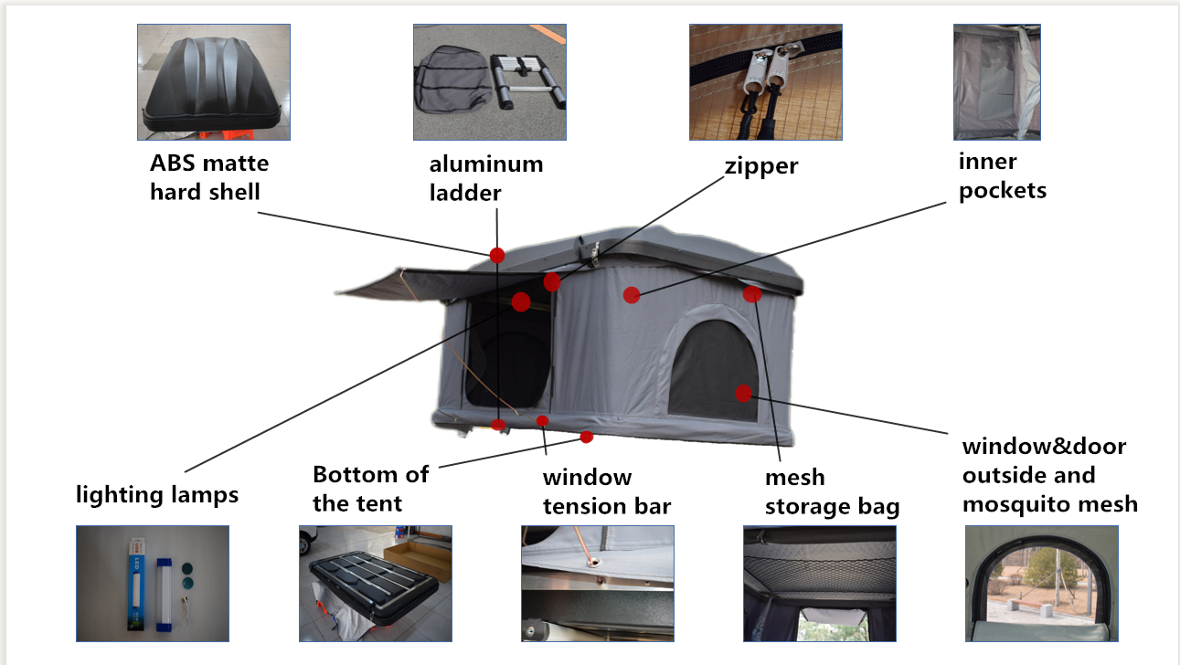 Two-person tent, can accommodate a family of three, large panoramic windows, wide view. It consists of four windows, the inner layer is equipped with anti-mosquito netting, the outer tent window is made of PVC transparent sequins, the tent is rain and sun protection, outdoor The first choice for self-driving tour, no need to build a quick drive, convenient to retract. Internal aluminum alloy frame, aluminum pole brace, aluminum alloy slub ladder, the length is suitable for various models, strong and durable.