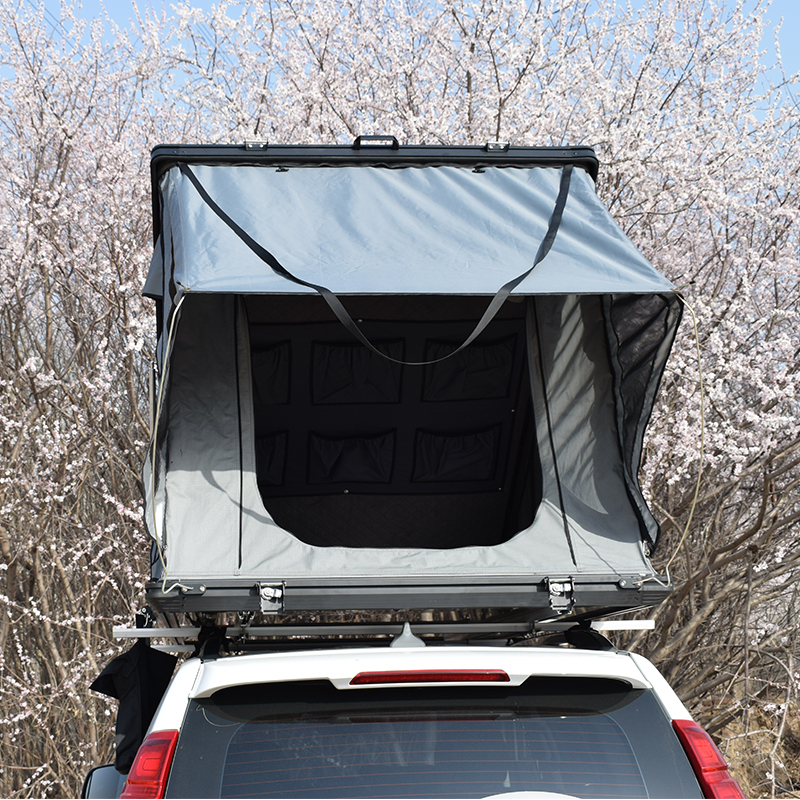 The shell is made of heat-resistant and high-temperature aluminum alloy. Car Roof Tent Outdoor Camping Roof Tent The fabric is a 600D polyester fabric, one of the strongest in the market. It is Flammable Resistant, as well as water, UV and Mildew resistant. It has stitched seams, excellent breathability, heavy duty zippers and even a skirt that fits over the edge of the shell base as to keep rain away from the inside.