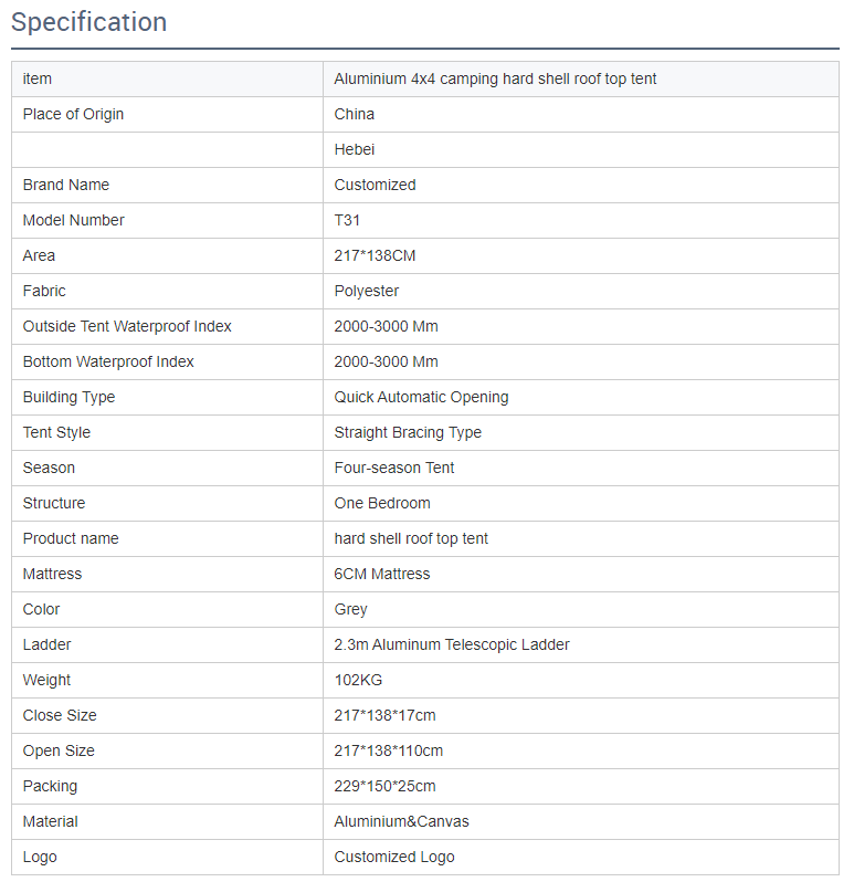 Products covering : trailer tent ,roof top tent ,car awning , swag ,sleeping bag , shower tent ,camping tent and so on . |